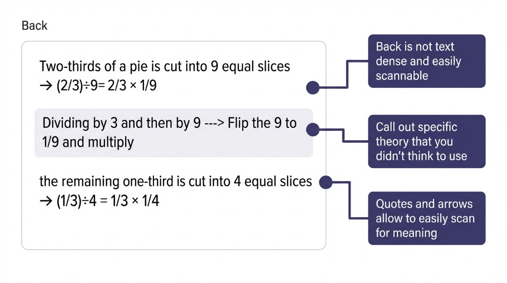Cover some of what you need but not all — e.g. how to choose which strategy to use, or how to spot a shortcut for the last few steps. Those "when to do what" moments are perfect for cards. | You can make cards for exactly those moments: strategy choice, first step, shortcut, or "when I see X, I do Y". |